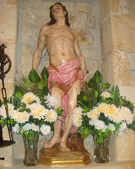 Halaber, San Antonen eskultura bat dago bertan, polikromatu gabea eta oinetan basurdea, makila, liburua eta kanpaia dituena. Baselizaren titularra, San Sebastian, modernoa da.