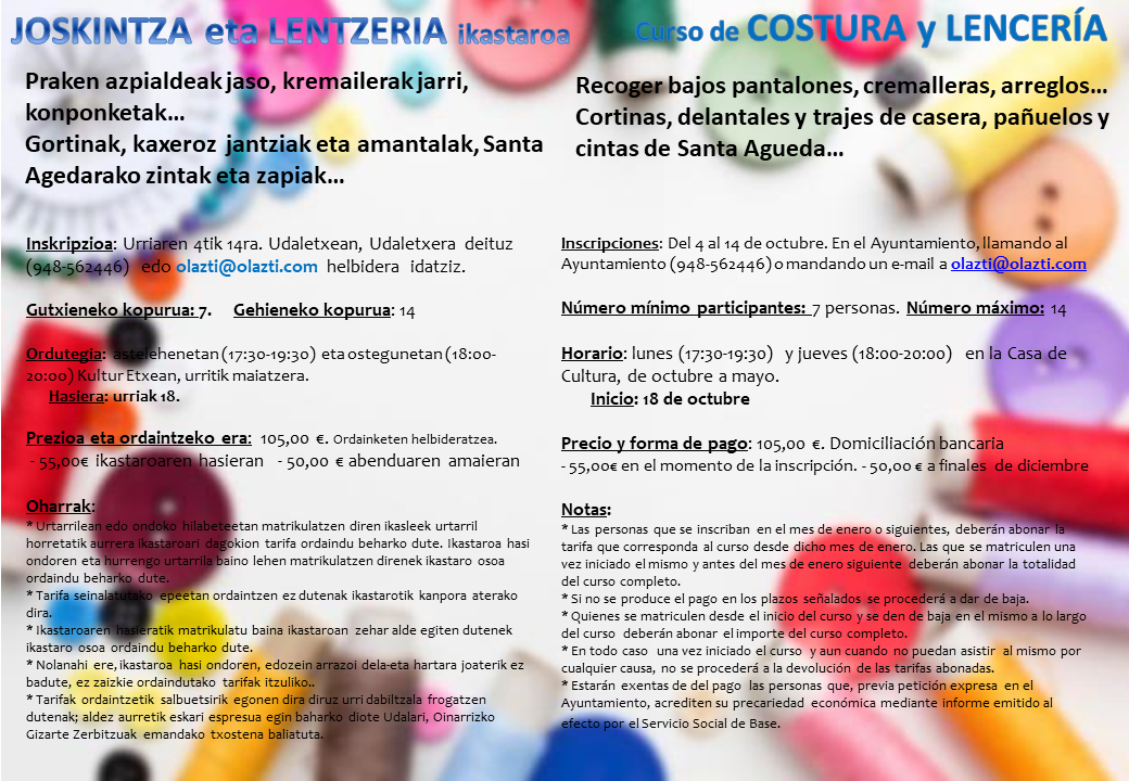 Recoger bajos pantalones, cremalleras, arreglos… Cortinas, delantales y trajes de casera, pañuelos y cintas de Santa Águeda… Inscripciones: Del 4 al 14 de octubre...