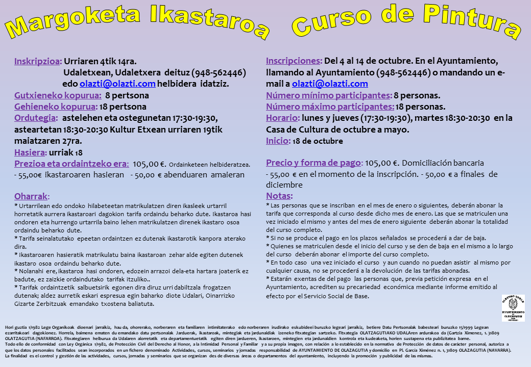 Inscripciones: Del 4 al 14 de octubre. En el Ayuntamiento, llamando al Ayuntamiento (948-562446) o mandando un e-mail a olazti@olazti.com Número mínimo participantes: 8 p...