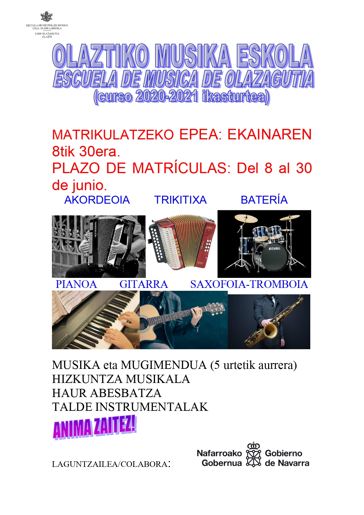 El plazo para matricularse en la Escuela Municipal de Música de Olazagutia se abre del 8 al 30 de junio. La oferta es la siguiente: Musica y movimiento (a partir de 5...
