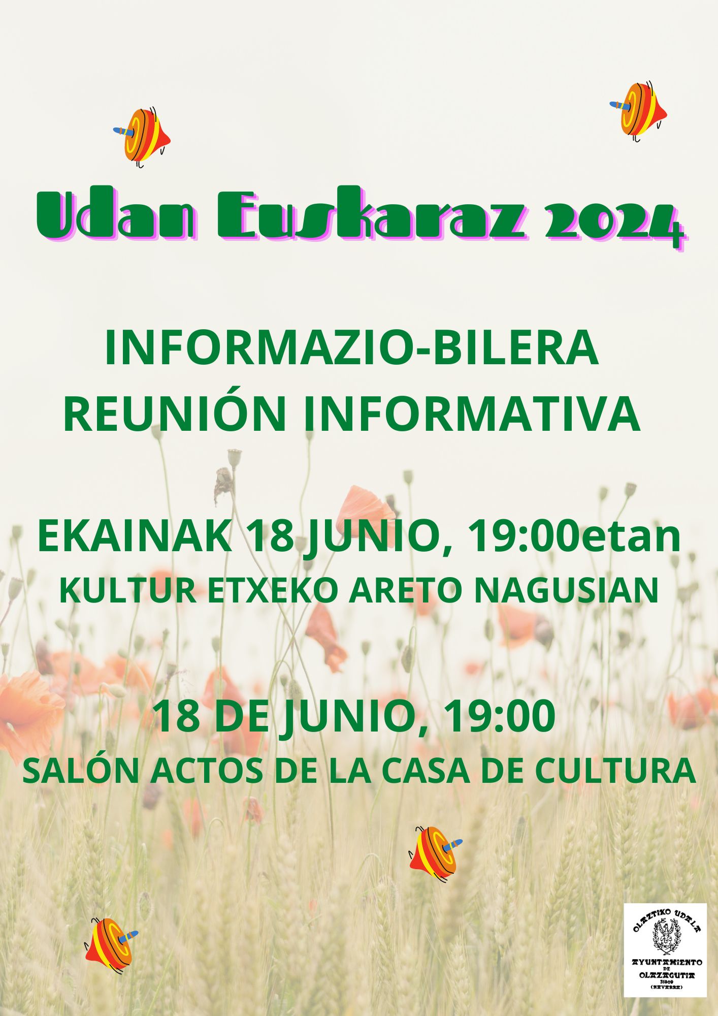 El martes 18 de junio a las 19:00h en la Casa de Cultura haremos una reunión para informar de la campaña Udan Euskaraz. Acudir a la reunión es importante. Para...