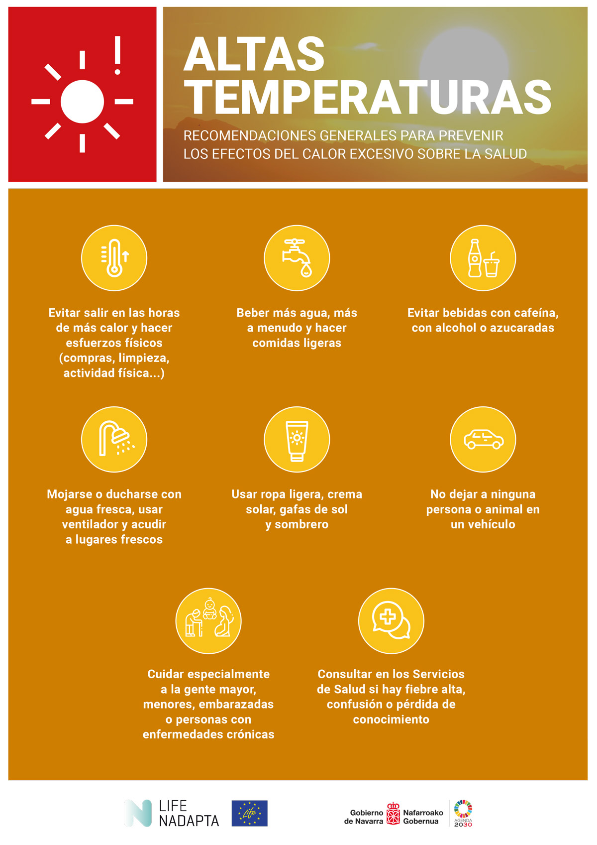 La Federación Navarra de Municipios y Concejos comunica una alerta naranja por altas temperaturas para los días 14, 15 y 16 de agosto decretada por el Instituto de Salud P...